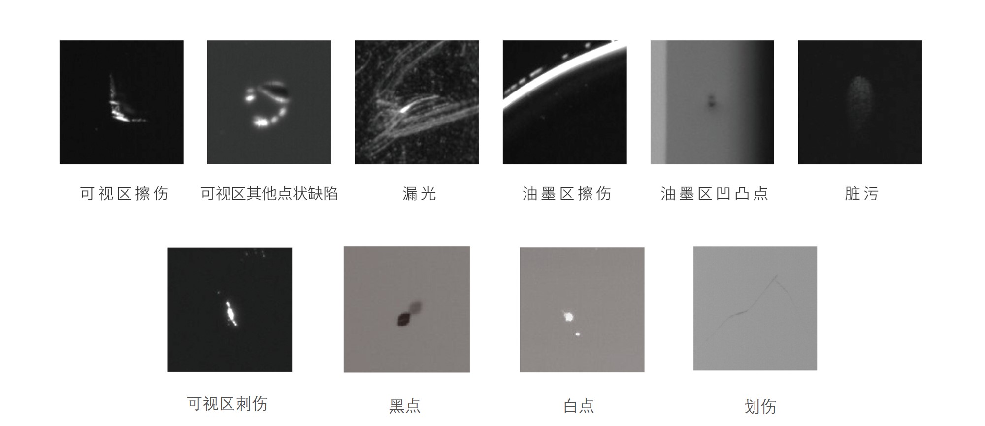划伤、点伤、脏污、崩边、凹凸点、油墨透光、孔瑕疵、异色